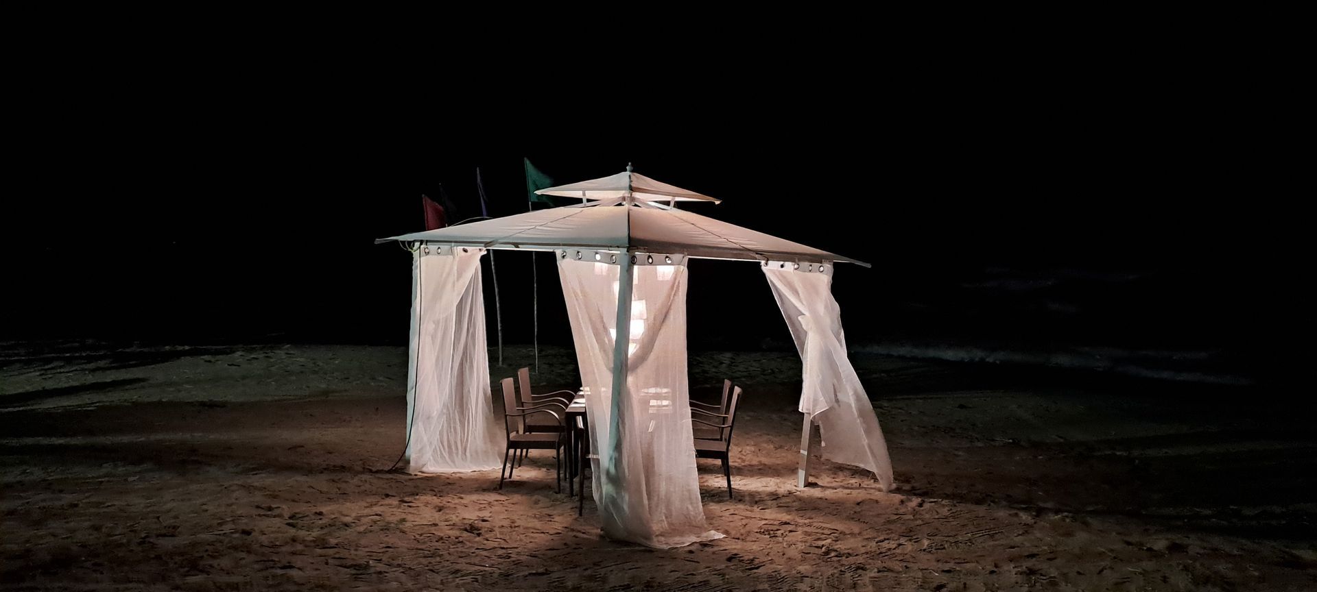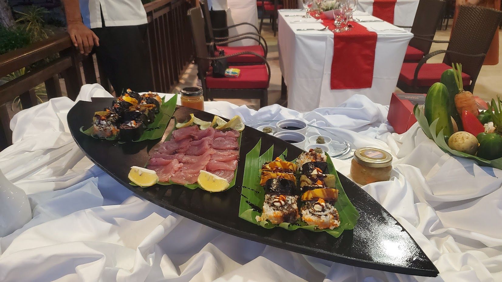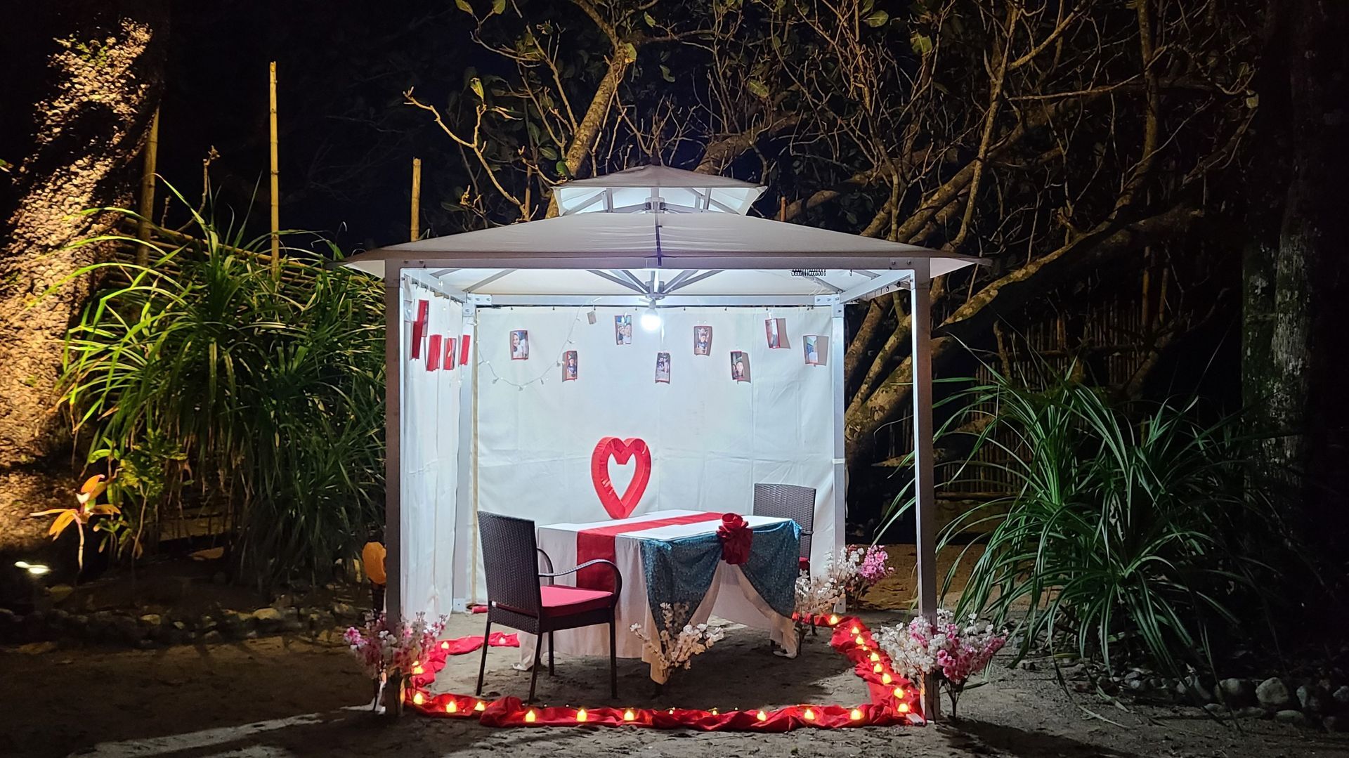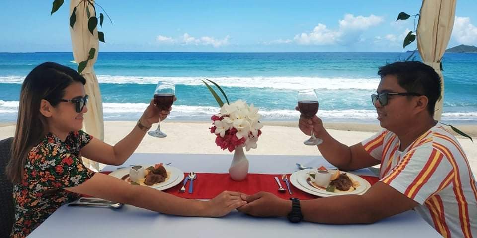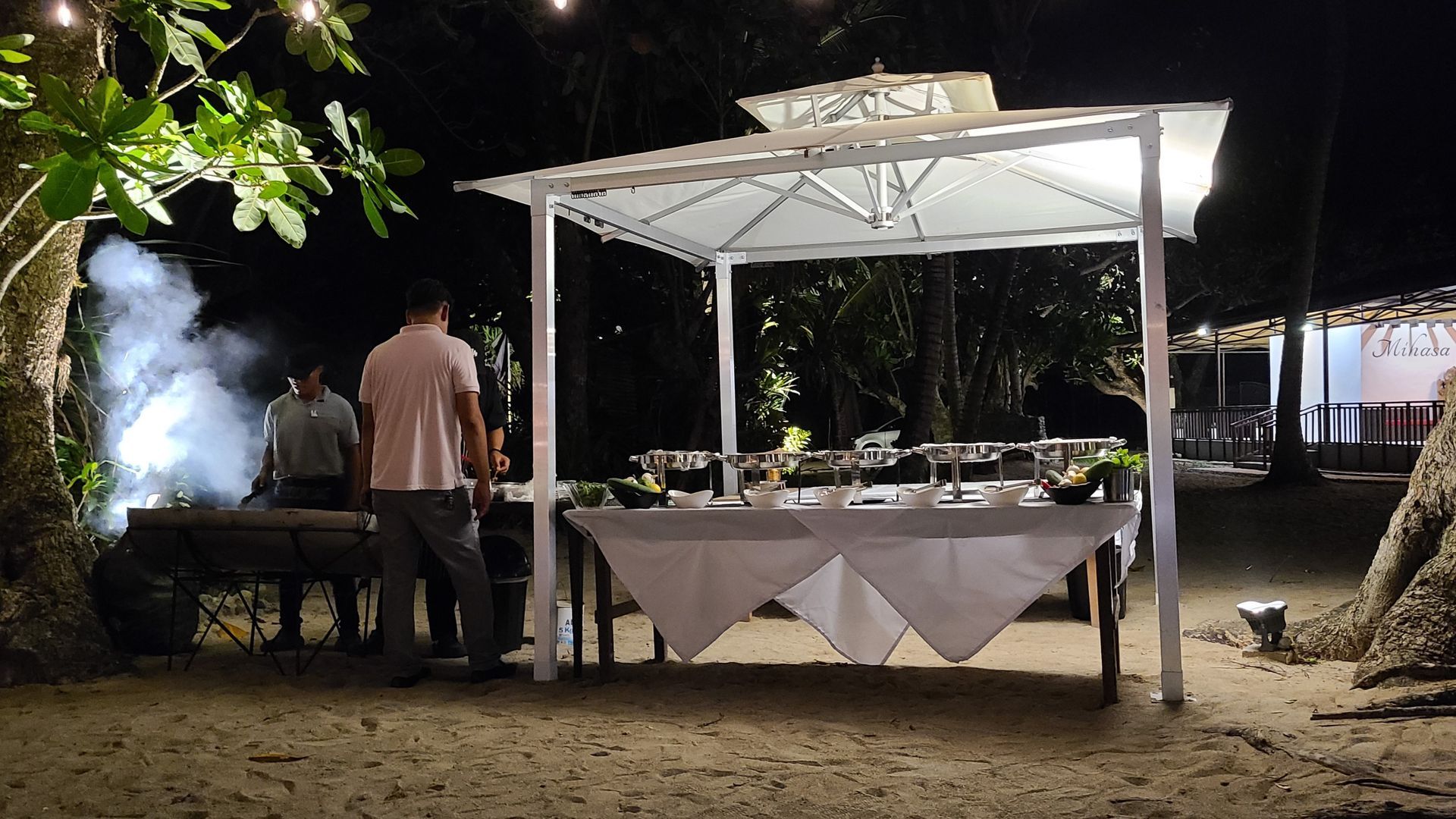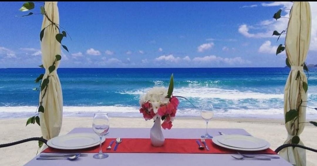 ....Picture an elegant table for two, at the beach sheltered by palm trees and serenaded by gentle ocean waves.